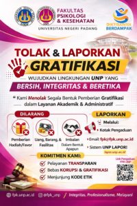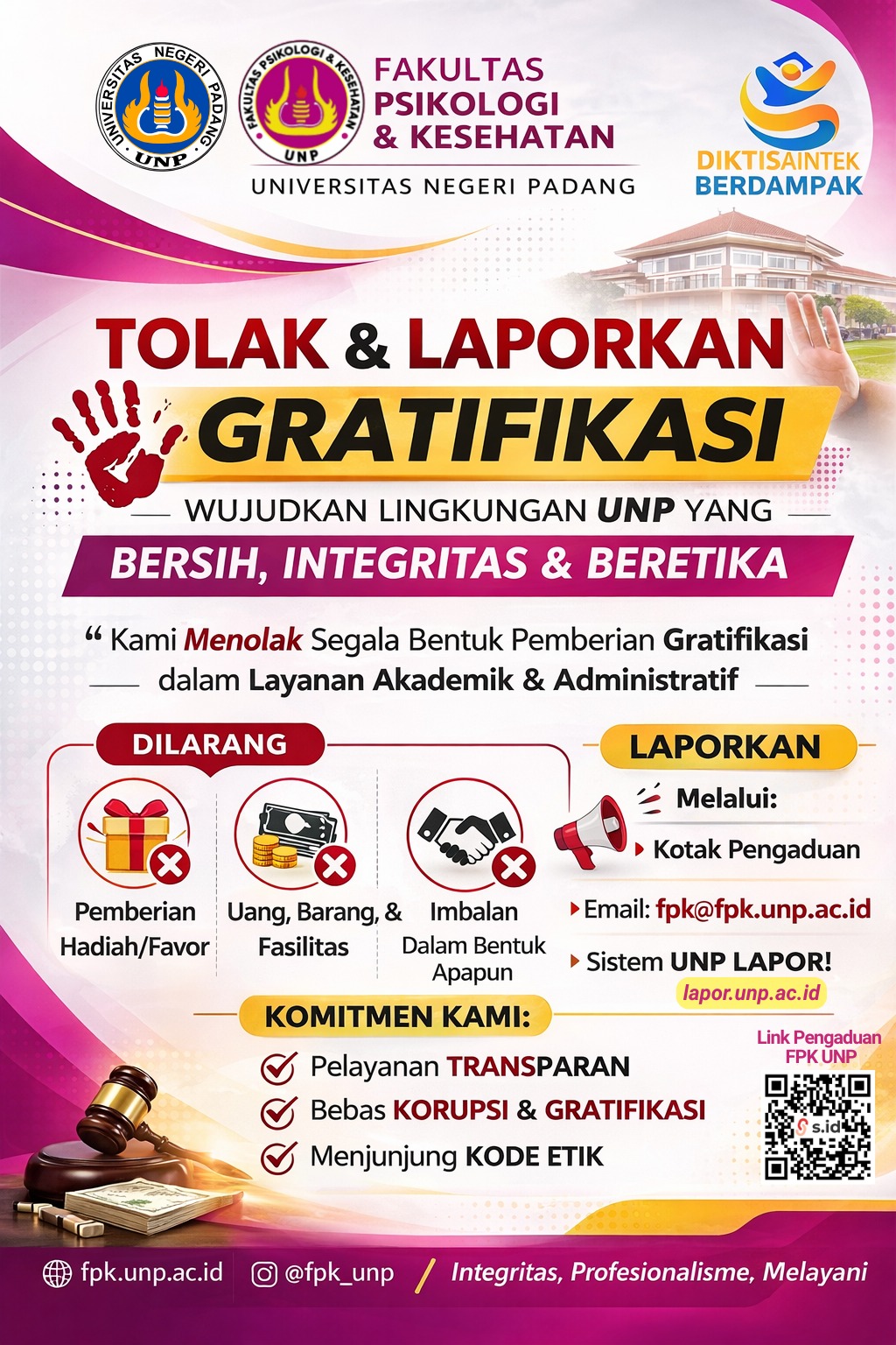 Fakultas Psikologi dan Kesehatan (FPK) Universitas Negeri Padang (UNP) kembali menegaskan komitmennya dalam mewujudkan tata kelola yang bersih, transparan, dan berintegritas melalui kampanye “Tolak dan Laporkan Gratifikasi”. Komitmen ini menjadi bagian dari upaya berkelanjutan FPK UNP dalam mendukung pembangunan Zona Integritas serta menciptakan lingkungan akademik dan administratif yang profesional serta beretika. Melalui kampanye ini, FPK UNP secara tegas menyatakan penolakan terhadap segala bentuk gratifikasi dalam layanan akademik maupun administratif. Gratifikasi yang dimaksud mencakup pemberian hadiah atau favor, uang, barang, fasilitas, maupun imbalan dalam bentuk apa pun yang berpotensi memengaruhi objektivitas,…